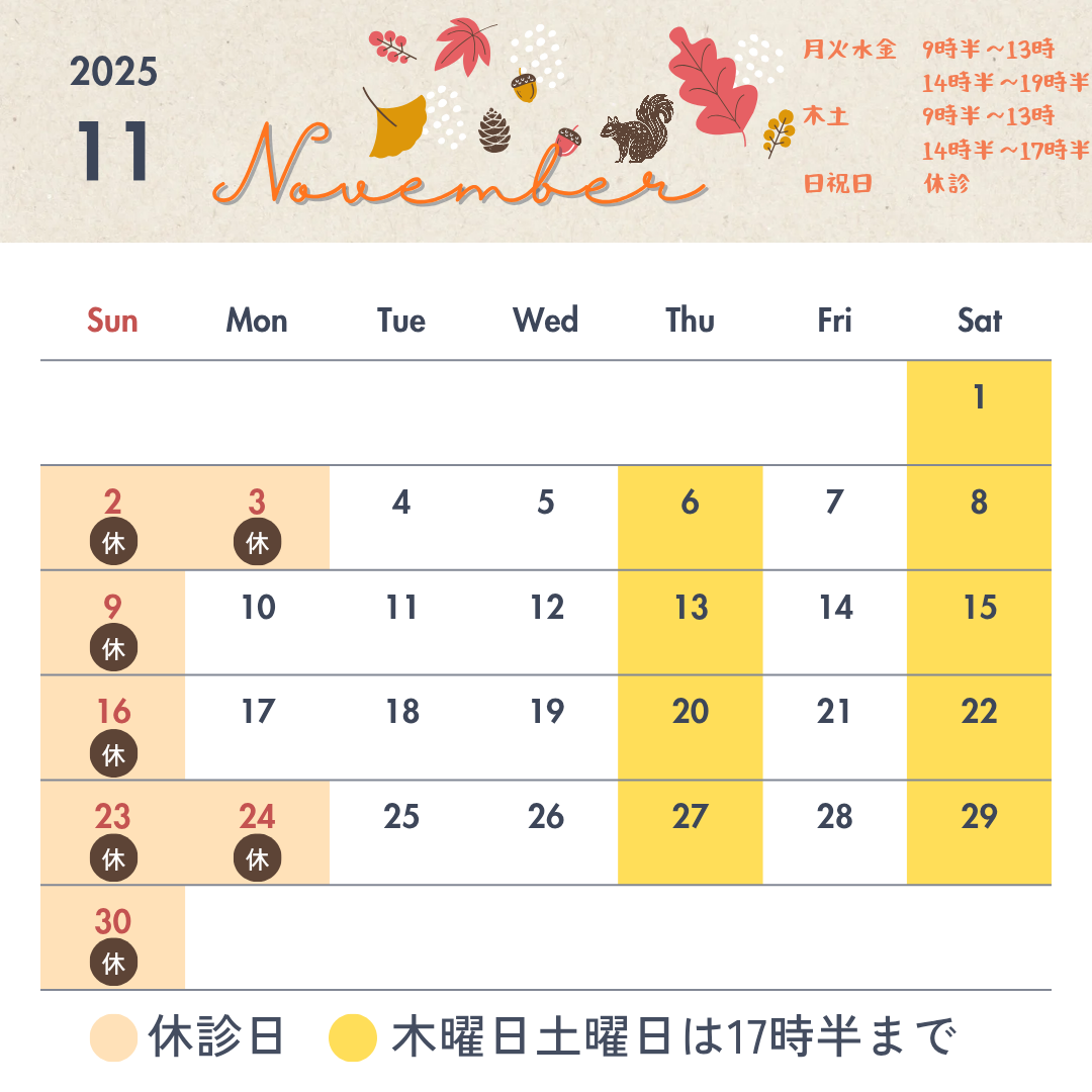 11/3㈪文化の日、11/24㈪勤労感謝の日の振り替え休日のため休診です。